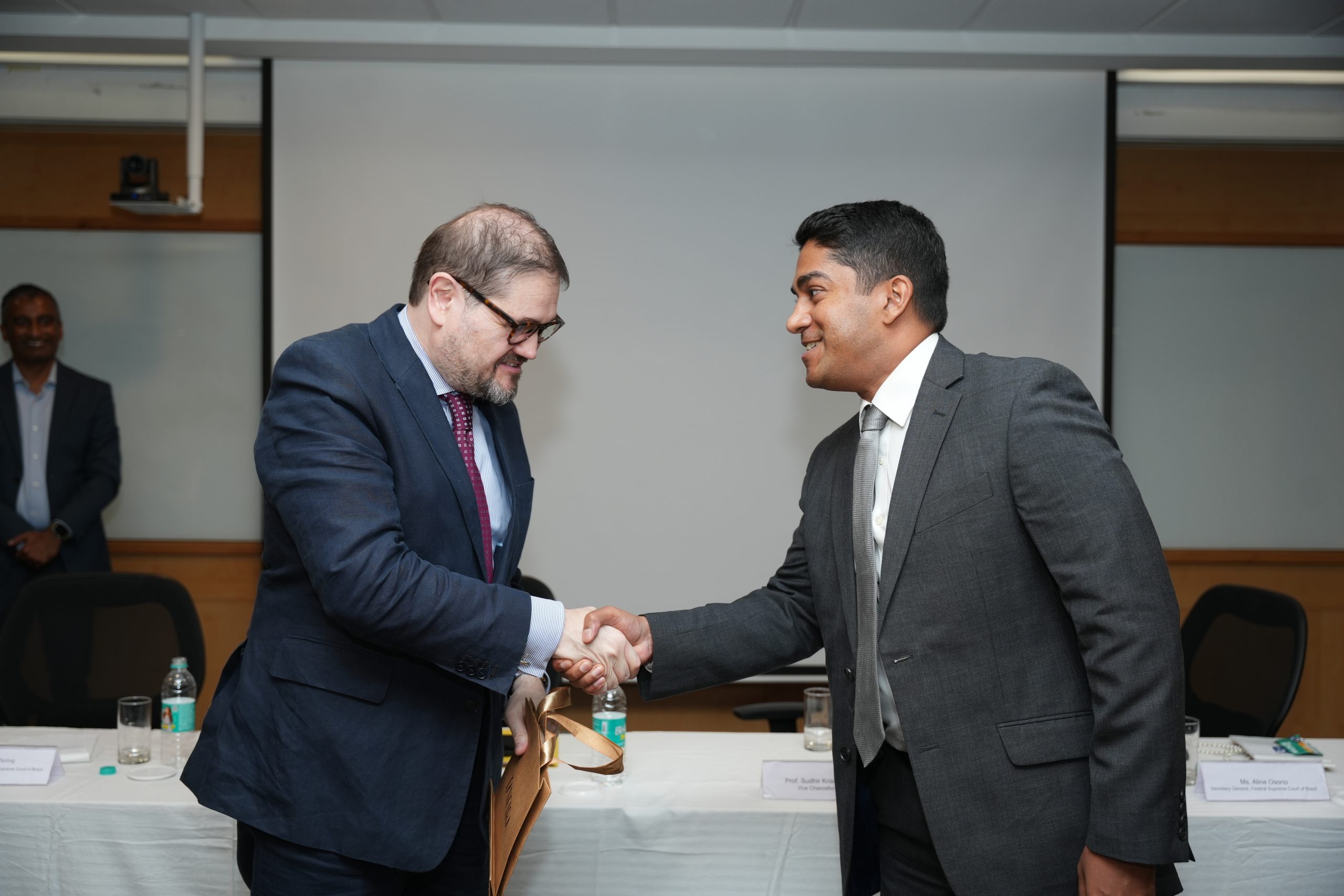 Their visit to the university campus began with an interaction with the NLSIU Vice-Chancellor Prof. (Dr.) Sudhir Krishnaswamy, followed by a session with faculty and researchers at NLSIU. Later in the day, Justice Barroso gave a talk to students from four different institutions in Bengaluru including NLSIU, St. Joseph’s College, MS Ramiah College, and the University Law College. Their visit ended with a tour of the NLSIU campus during which they were briefed about the latest developments and upcoming projects on campus.