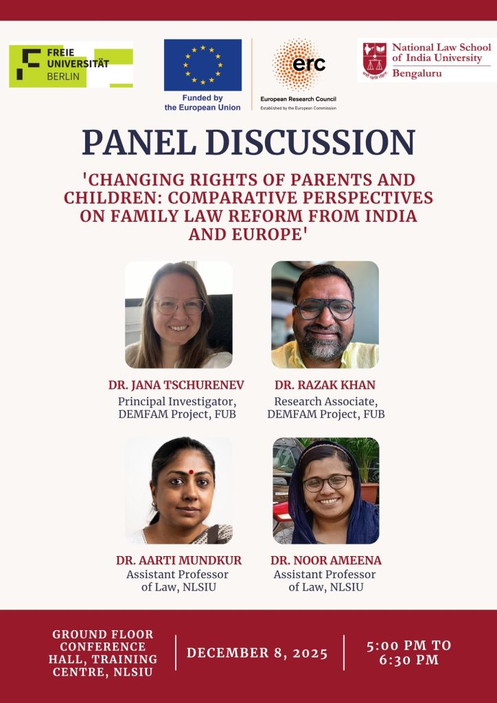 The Centre for Women and the Law (CWL), NLSIU, in collaboration with Freie Universität Berlin (FUB) and ERC Research Group, is organising a panel discussion on ‘Changing Rights of Parents and Children: Comparative Perspectives on Family Law Reform from India and Europe’ on December 8, 2025, at the Ground Floor Conference Hall, Training Centre, NLSIU.