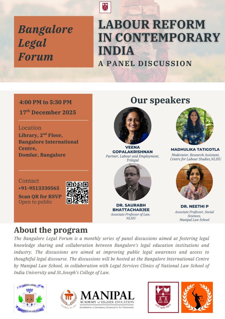 NLSIU’s Legal Services Clinic, in collaboration with Manipal Law School and St. Joseph’s College of Law, as part of the Bangalore Legal Forum (BLF), is organising a panel discussion titled “Labour Reform in Contemporary India.” The session will focus on unpacking the Four New Labour Codes, their structure, policy trajectory, and implications for workers, industry, and state regulation.