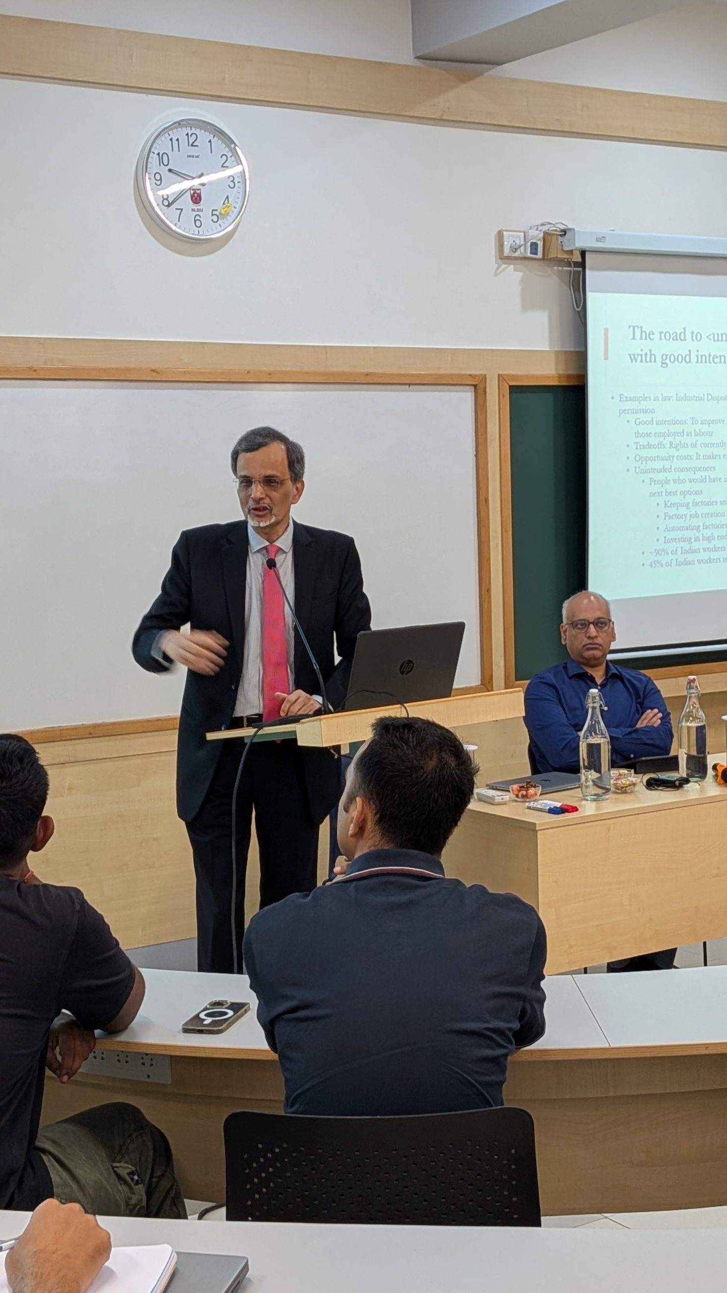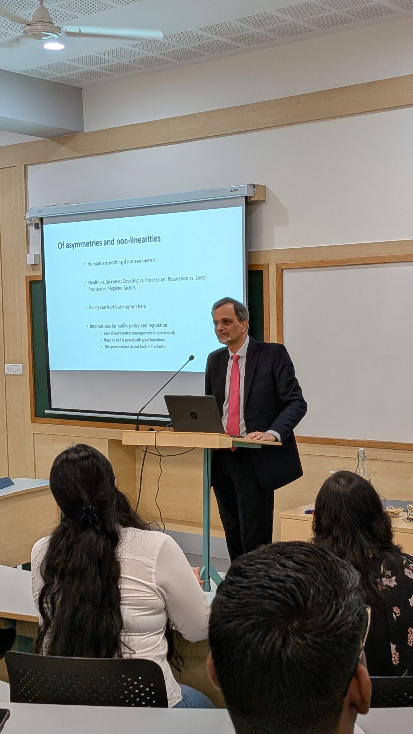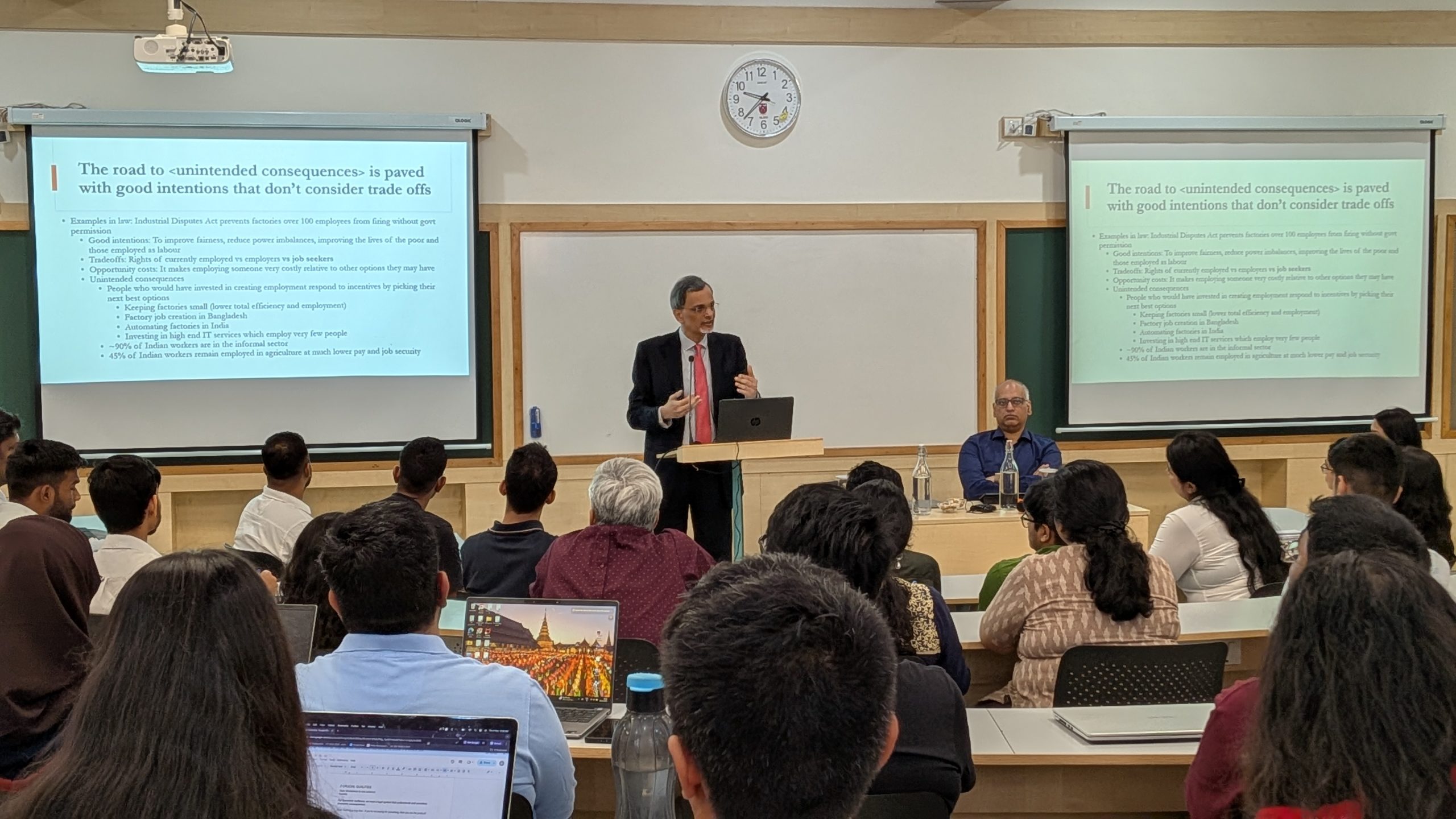 The world economy is changing, and India has a narrow window of opportunity to grow fast and take its place within it as a major global player, which would also provide a high standard of living to its citizens. In this session, Dr. Anantha covered why the legal system must play an essential role in this process, where the lacunae exist presently especially from the perspective of economically grounded reasoning in our legal system. Specifically, Dr. Anantha covered the importance of trade-offs, opportunity costs and unintended consequences. The session also took students through the application of the lens of economic reasoning to some prominent issues.