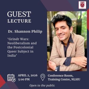 The National Law School of India University (NLSIU), Bengaluru is hosting a lecture by Dr. Shannon Philip, Assistant Professor, Department of Sociology, University of Cambridge. Titled “Grindr Wars: Neoliberalism and the Postcolonial Queer Subject in India,” the lecture will take place on Thursday, April 2, 2026, at 5 pm at the Conference Room, Training Centre, NLSIU.